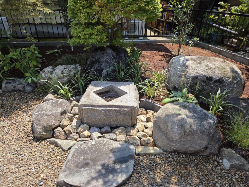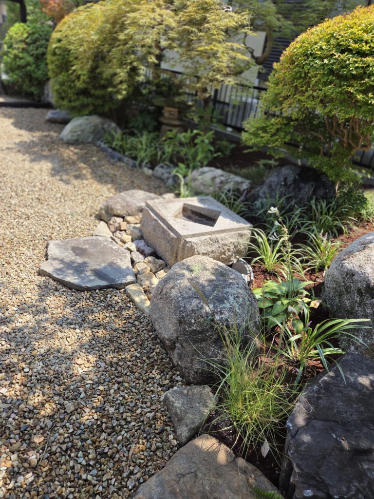 ひし形の蹲がチャート石に良く合います。