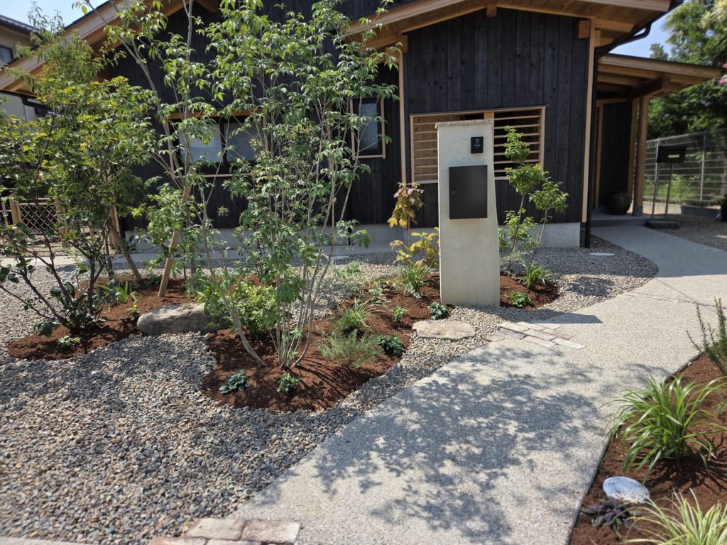 お盆が明けたというのに、暑さが一向にやまない日々の中、7月上旬からお庭の工事に入っております。自然素材を活かした設計士、丹羽アトリエ様よりご依頼の新舞子のお庭が完成に近づいております。植栽も追加されて、より一層素敵なお庭になりました^^
