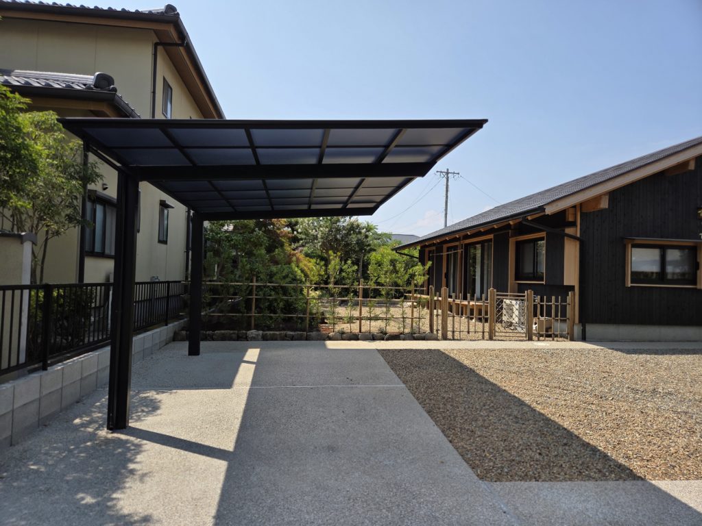 お家の色とフェンスの色を合わせることで自然素材ではないカーポートの存在を風景に溶け込ませました。