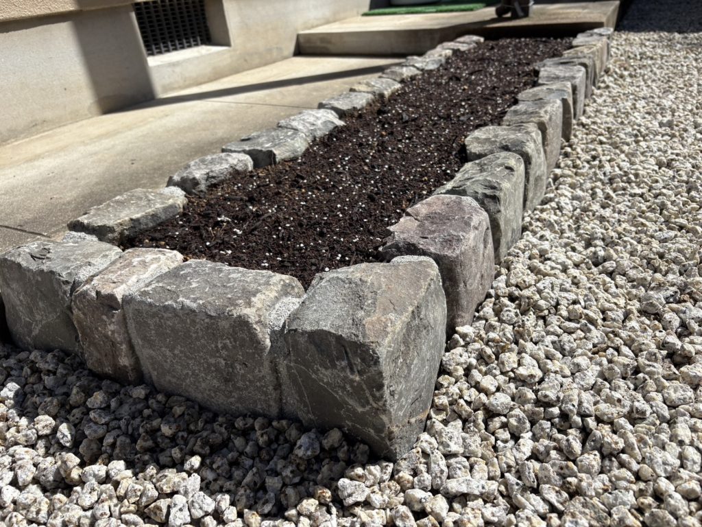 右側新しいブロックはユニソン化粧ブロックのタウラを使用、シンプルな笠木を使用しました。左側の花壇は竹藤商店のフランデルストーン古ピンコロを使用し、味わいのある仕上がりとなりました。