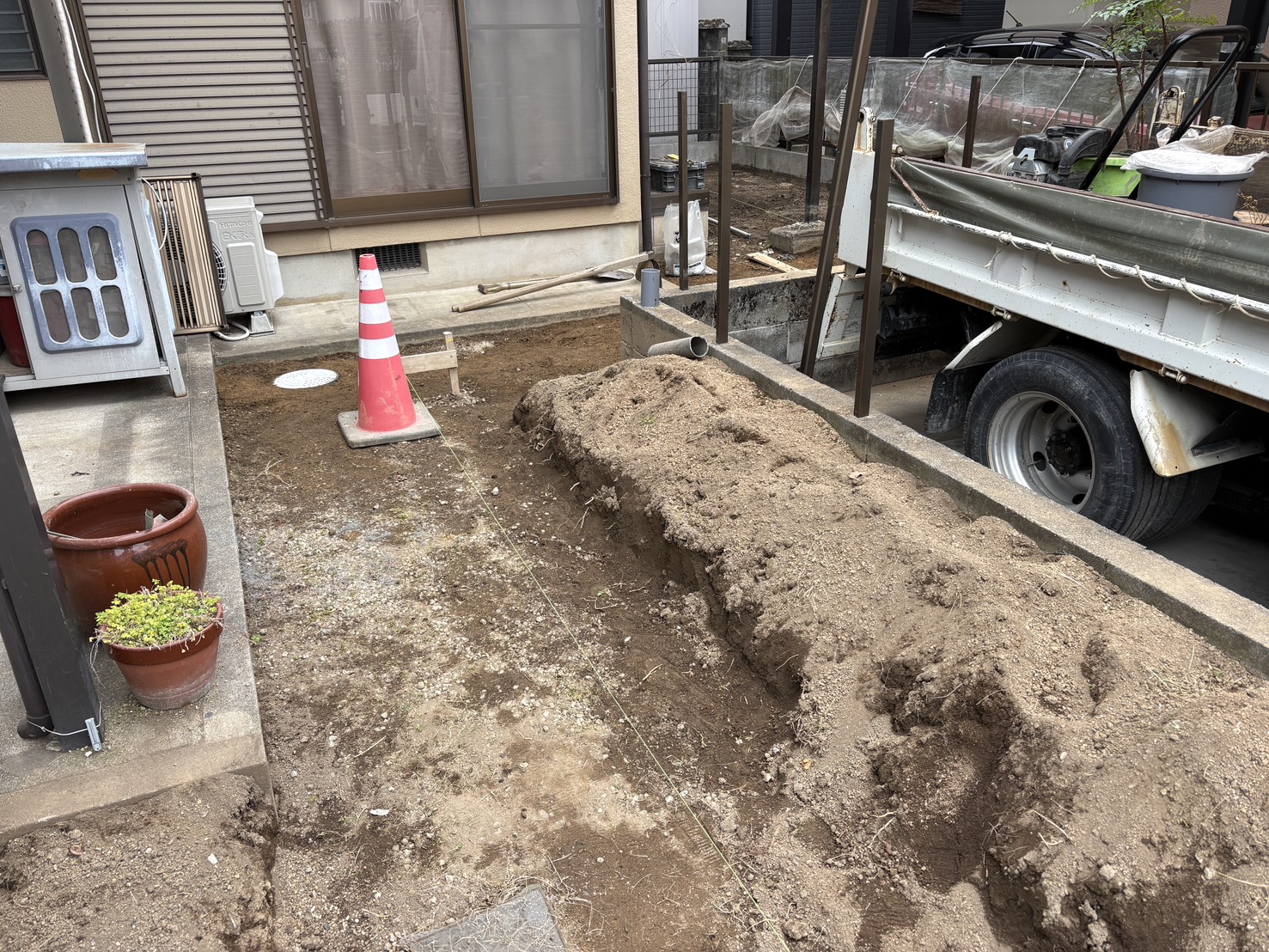既設コンクリートブロックの土留めを撤去し、新しい化粧ブロックを使用して土留めにしていきます。