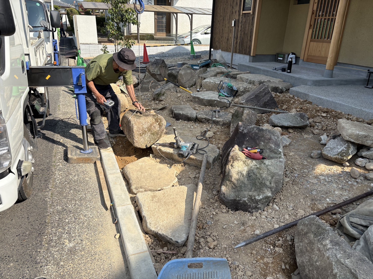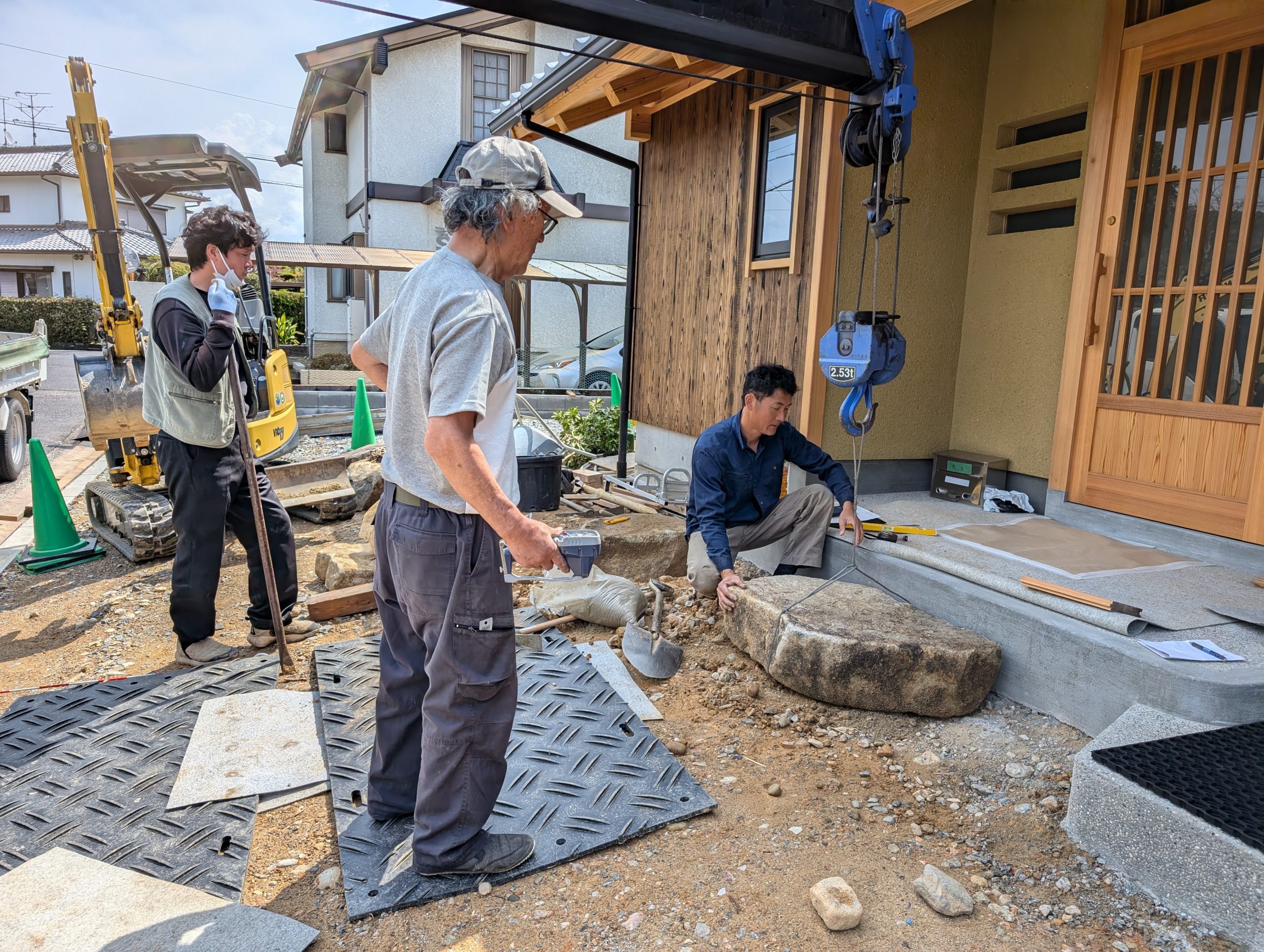 とても静かな場所で近所から鶯の鳴き声を聞きながら作業できるのどかな場所での作業でした。お若いご夫婦の施主様ですが昔ながらの石組や庭園を好まれ「大きい石をふんだんに使って欲しい」とのご要望をいただきました。現代では時世庭園を解体してほしいという依頼が多い中。石を活かすお庭ということで私どもも力が入ったお庭造りとなりました。社長の父も現場に立ち、長年培ってきた石組の技を発揮いたしました。その過程は私たち社員にとっても貴重な学びの場となりました。