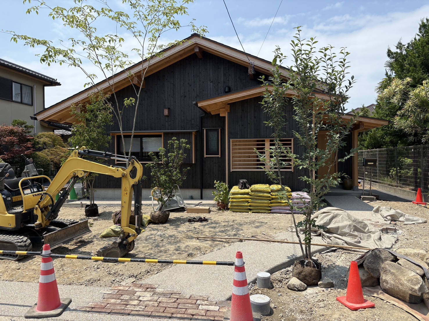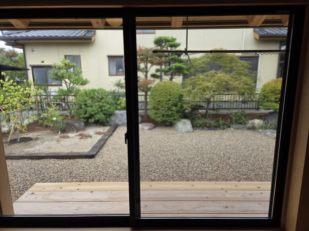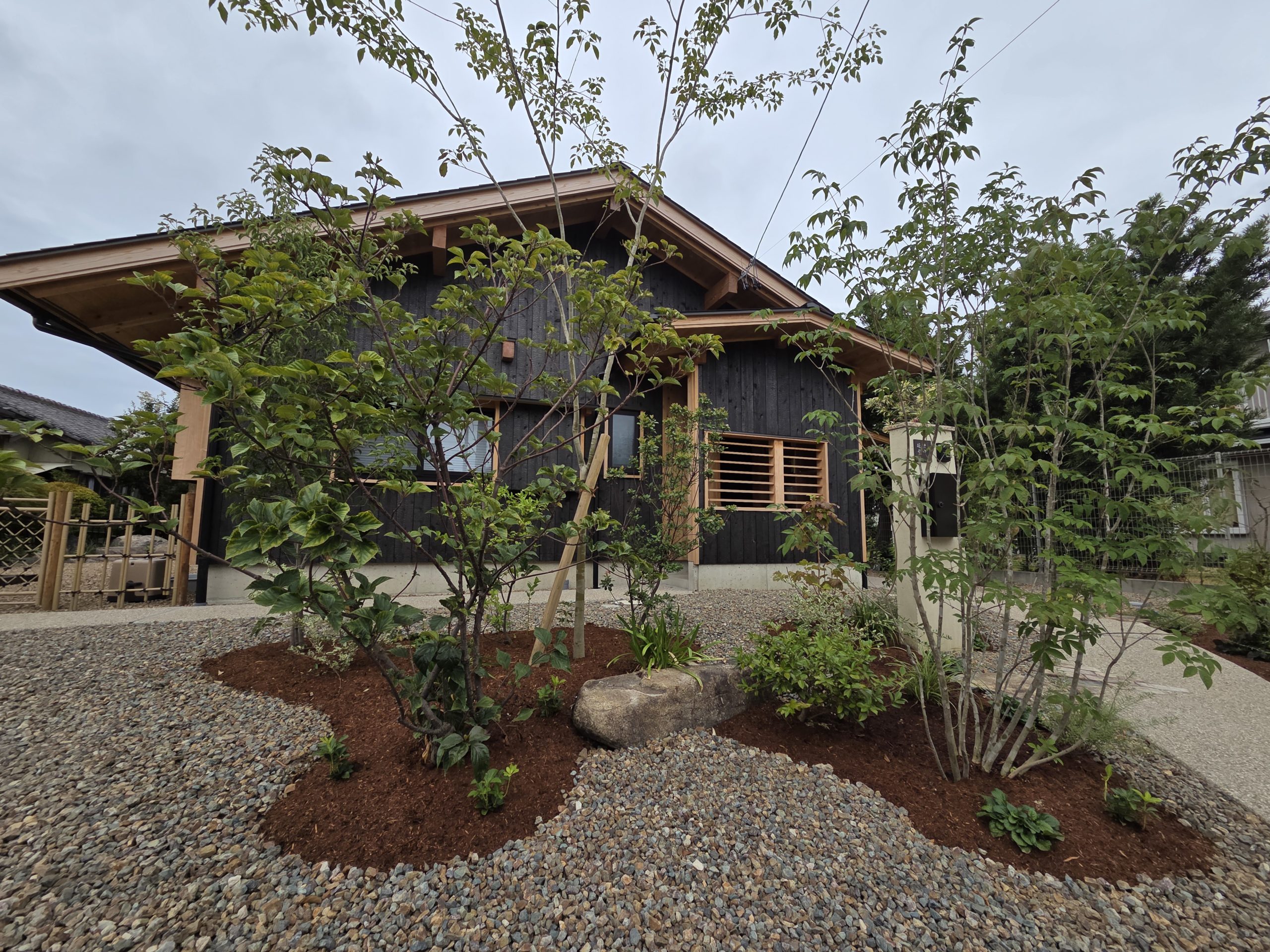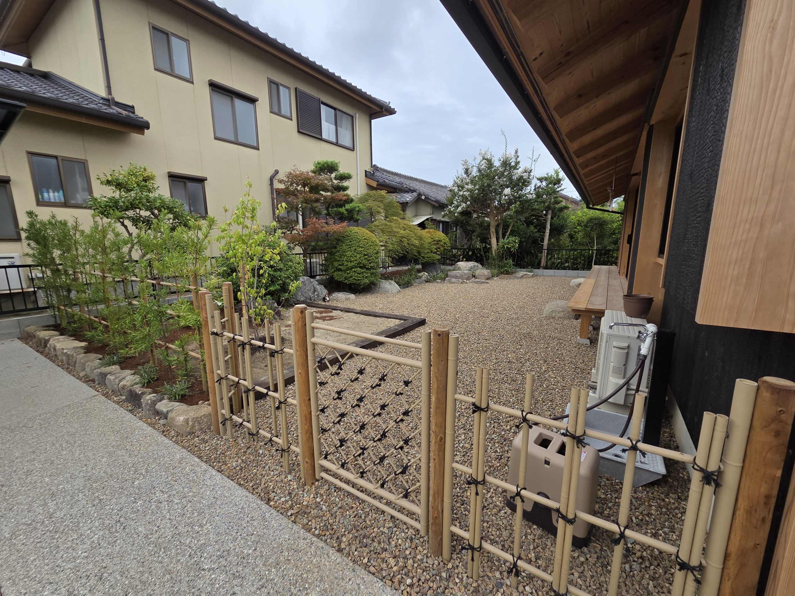 庭内は防草シートとチャート石で草が生えないように施しました。ひし形の蹲がお洒落な感じでハイカラな和庭園となりました。