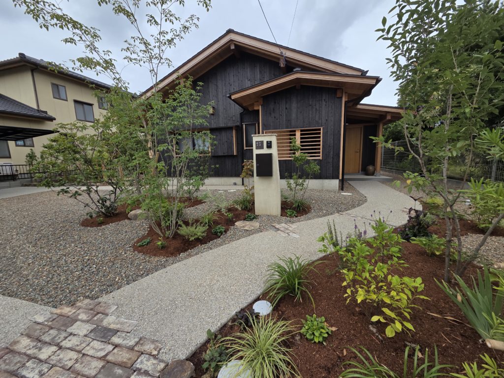 機能門柱は弊社ニワ暮ラフトで造作しました。オリジナル作品です。丸みを帯びた曲線とアプローチの曲線がよく合います。